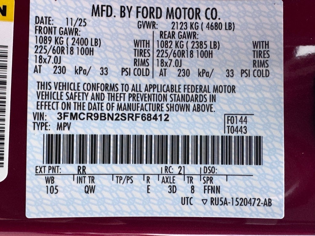 Well equipped with: Convenience Package (Front Driver/Passenger Seat Back Map Pockets, Heated 8-Way Power Driver's Seat, LED Fog Lamps, Premium Wrapped Steering Wheel, and Universal Garage Door Opener (UGDO)), Equipment Group 200A, 2nd Row Carpeted Seatback, 4-Wheel Disc Brakes, 6 Speakers, ABS brakes, Air Conditioning, Alloy wheels, AM/FM radio: SiriusXM, AM/FM Stereo, Auto High-beam Headlights, Automatic temperature control, Brake assist, Cloth w/Easy-to-Clean Front Bucket Seats, Compass, Delay-off headlights, Driver door bin, Driver vanity mirror, Dual front impact airbags, Dual front side impact airbags, Electronic Stability Control, Emergency communication system: SYNC 4 911 Assist, Four wheel independent suspension, Front anti-roll bar, Front Bucket Seats, Front Center Armrest, Front reading lights, Fully automatic headlights, Heated door mirrors, Illuminated entry, Knee airbag, Low tire pressure warning, Occupant sensing airbag, Outside temperature display, Overhead airbag, Overhead console, Panic alarm, Passenger door bin, Passenger vanity mirror, Power door mirrors, Power steering, Power windows, Radio data system, Rear anti-roll bar, Rear Parking Sensors, Rear reading lights, Rear seat center armrest, Rear window defroster, Rear window wiper, Remote keyless entry, Security system, SiriusXM, Speed control, Speed-sensing steering, Speed-Sensitive Wipers, Split folding rear seat, Steering wheel mounted audio controls, SYNC 4 w/Enhanced Voice Recognition, Tachometer, Telescoping steering wheel, Tilt steering wheel, Traction control, Trip computer, Variably intermittent wipers, Wheels: 17 Carbonized Gray-Painted Aluminum, and Wheels: 18 Dark Gravity Gray-Painted Aluminum.