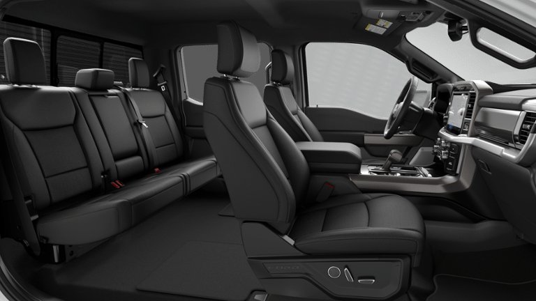 Well equipped with: Bed Utility Package (4 Pickup Box Tie-Down Plates, Bed Storage Boxes, LED Box Lighting, and Tailgate Step with Work Surface), Equipment Group 501A Mid (6 Angular Bright Anodized Step Bar, ActiveX Trimmed Bucket Seats, Illuminated Driver and Passenger Visors, Power-Adjustable Pedals with Memory, Power-Sliding Rear Window, Radio: B&O Sound System by Bang and Olufsen, SYNC 4 with Enhanced Voice Recognition, and Wheels: 20 Chrome-Like PVD), Ford Connectivity Package (1-Year Included), FX4 Off-Road Package (4x4 FX4 Off-Road Bodyside Decal, Hill Descent Control, Monotube Rear Shocks, Off-Road Tuned Front Shock Absorbers, Rock Crawl Mode, and Tray Style Floor Liner Without Carpet Mats), Internet access capable: 5G Modem - Ford Connectivity Package, Lariat Black Appearance Package (Black Exterior Badging, Black Grille, Black Taillamp Bezels, Body-Color Front and Rear Bumpers, Dark Interior Appliques, Gray Box Side Decal, and Matte Black Tailgate F-150 Decal), 4WD, 4-Wheel Disc Brakes, 8 Speakers, ABS brakes, Air Conditioning, Alloy wheels, AM/FM radio: SiriusXM with 360L, Auto High-beam Headlights, Auto-dimming door mirrors, Auto-dimming Rear-View mirror, Automatic temperature control, Brake assist, Bumpers: chrome, Chrome wheels, Compass, Delay-off headlights, Driver door bin, Driver vanity mirror, Dual front impact airbags, Dual front side impact airbags, Electronic Stability Control, Emergency communication system: SYNC 4 911 Assist, Front anti-roll bar, Front Bucket Seats, Front Center Armrest, Front dual zone A/C, Front fog lights, Front reading lights, Front wheel independent suspension, Fully automatic headlights, Garage door transmitter, Heated door mirrors, Heated front seats, Heated steering wheel, Illuminated entry, Low tire pressure warning, Memory seat, Navigation system: Connected Navigation, Occupant sensing airbag, Outside temperature display, Overhead airbag, Overhead console, Panic alarm, Passenger door bin, Passenger vanity mirror, Power door mirrors, Power driver seat, Power passenger seat, Power steering, Power windows, Radio data system, Rain sensing wipers, Rear reading lights, Rear seat center armrest, Rear step bumper, Rear window defroster, Remote keyless entry, Security system, Speed control, Split folding rear seat, Steering wheel mounted audio controls, Tachometer, Telescoping steering wheel, Tilt steering wheel, Tough Bed Spray-in Bedliner, Traction control, Trip computer, Turn signal indicator mirrors, Variably intermittent wipers, Ventilated front seats, and Wheels: 18 Chrome-Like PVD.