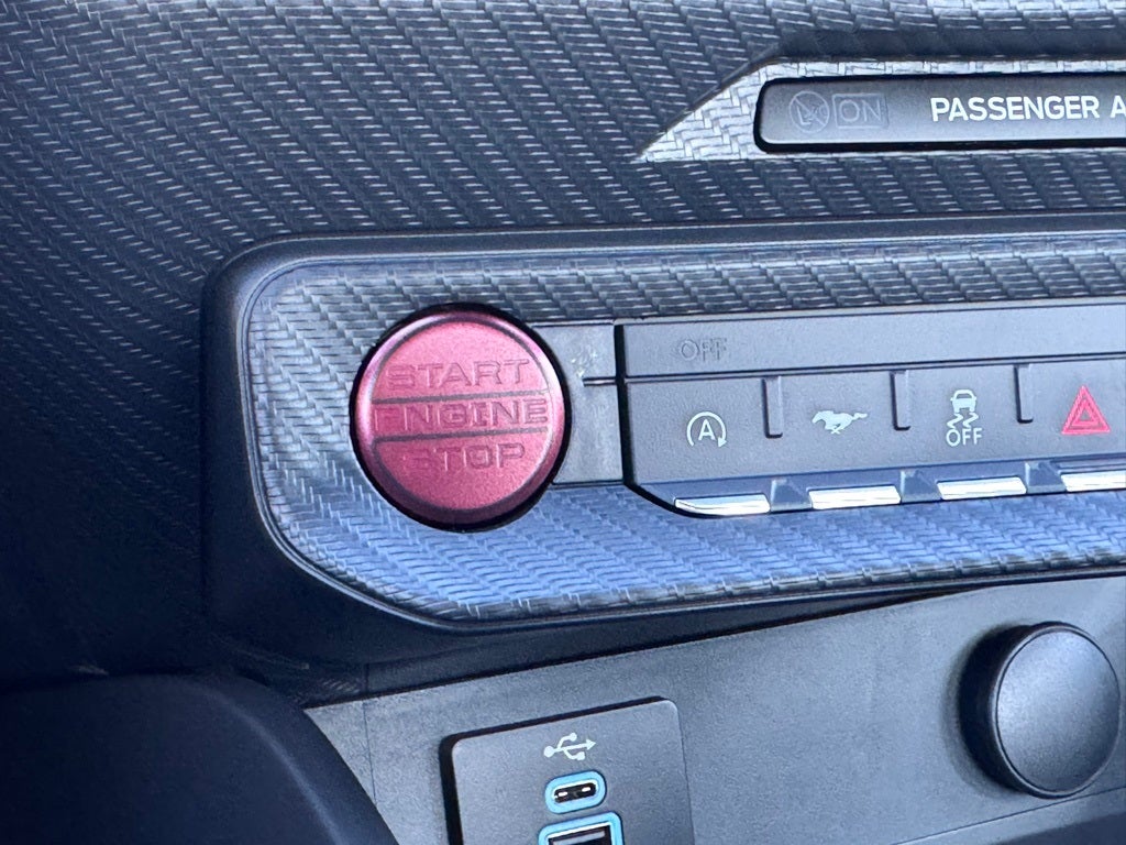 Well equipped with: 1st Row Carpeted Black Floor Mats, 4-Wheel Disc Brakes, ABS brakes, Active Valve Performance Exhaust, Air Conditioning, Alloy wheels, AM/FM Stereo, Auto High-beam Headlights, Automatic temperature control, Brake assist, Bumpers: body-color, Compass, Delay-off headlights, Driver door bin, Driver vanity mirror, Dual front impact airbags, Dual front side impact airbags, Electronic Stability Control, Emergency communication system: 911 Assist, Exterior Parking Camera Rear, Four wheel independent suspension, Front anti-roll bar, Front Bucket Seats, Front Center Armrest, Front dual zone A/C, Front reading lights, Fully automatic headlights, Illuminated entry, Knee airbag, Leather Shift Knob, Low tire pressure warning, Occupant sensing airbag, Outside temperature display, Overhead airbag, Overhead console, Panic alarm, Passenger door bin, Passenger vanity mirror, Power door mirrors, Power steering, Power windows, Radio data system, Rain sensing wipers, Rear anti-roll bar, Rear Parking Sensors, Rear window defroster, Remote keyless entry, Speed control, Speed-sensing steering, Speed-Sensitive Wipers, Split folding rear seat, Sport steering wheel, Steering wheel mounted audio controls, SYNC 4, Tachometer, Telescoping steering wheel, Tilt steering wheel, Traction control, Trip computer, Variably intermittent wipers, and Voltmeter.