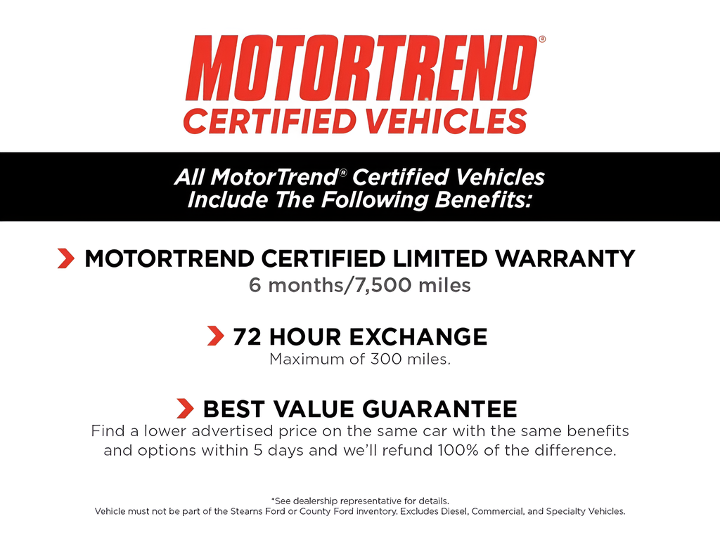 ONE PREVIOUS OWNER. LOW MILEAGE. ABS BRAKES. ALUMINUM ALLOY WHEELS. EXPRESS OPEN AND CLOSE FIRST AND SECOND ROW SUNROOF WITH POWER SUNSHADE. HEATED LEATHER STEERING WHEEL. HEATED AND VENTILATED FRONT BUCKET SEATS. HEADS-UP DISPLAY. COMPASS. TIRE SPECIFIC LOW TIRE PRESSURE WARNING. INFOTAINMENT SYSTEM VOICE COMMAND. PERIMETER ALAM. Clean CARFAX. Buy with Confidence from the Stearns Family — Serving Our Community for Over 50 Years! At County, we make car buying easy and worry-free! Every vehicle under 5 years old and with less than 80,000 miles comes Motor Trend Certified — packed with exclusive benefits: ✅ 6-Month / 7,500-Mile Limited Warranty ✅ 3 Years of Free Maintenance at our dealership ✅ 3-Day Exchange Policy — love it or swap it! ✅ 5-Day Best Value Guarantee — find a better deal and we’ll refund the difference! ✅ Exterior & Interior Protection to keep your vehicle looking new longer We’re confident in the quality of our cars — that’s why we back them with our Best Value Guarantee. If you find a comparable vehicle (same year, trim, mileage, and benefits) at a lower price, we’ll cut you a check for the difference! With over 300 used and 200 new vehicles across two nearby locations, you’ll always find a great selection and an even better deal. Why buy anywhere else? Visit us today and experience the Stearns Family difference — where great cars, great value, and great service come standard. Note: Prices and payments apply to in-stock units only and do not include tax, tag, title, or the $697 dealer administrative fee. Dealer-installed packages include ResistAll Appearance Protection ($999) and Ikon Theft Protection ($999). Offers may vary based on credit, incentives, and financing through Ford Motor Credit. For County Ford pricing, a 2021 or newer trade-in is required.